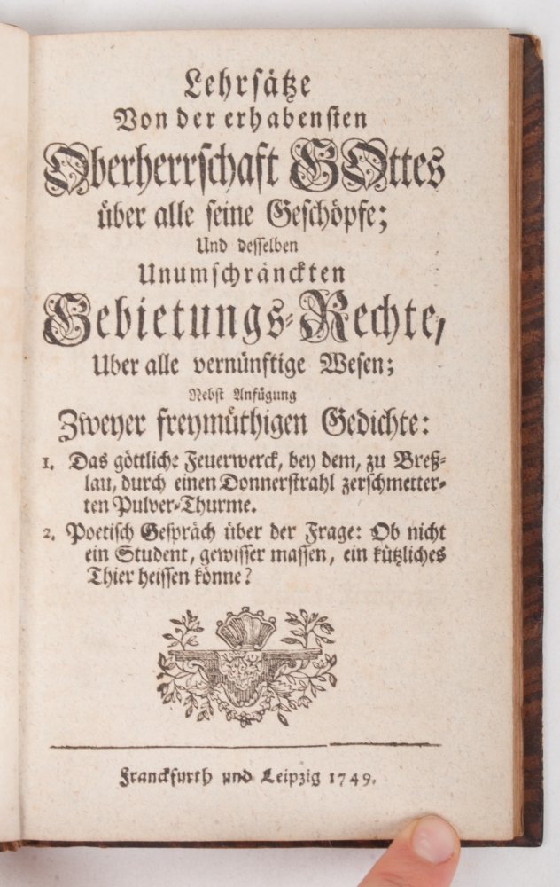 Lehrsätze von der erhabensten Oberherrschaft Gottes über alle seine Geschöpfe; und desselben unumschrankten Gebietungs=Rechte, uber alle vernünftige Wesen; nebst Unsuegung Zweyer freymüthigen Gedichte. [D. Philippi] Frankfurth und Leipzig, 1749.
