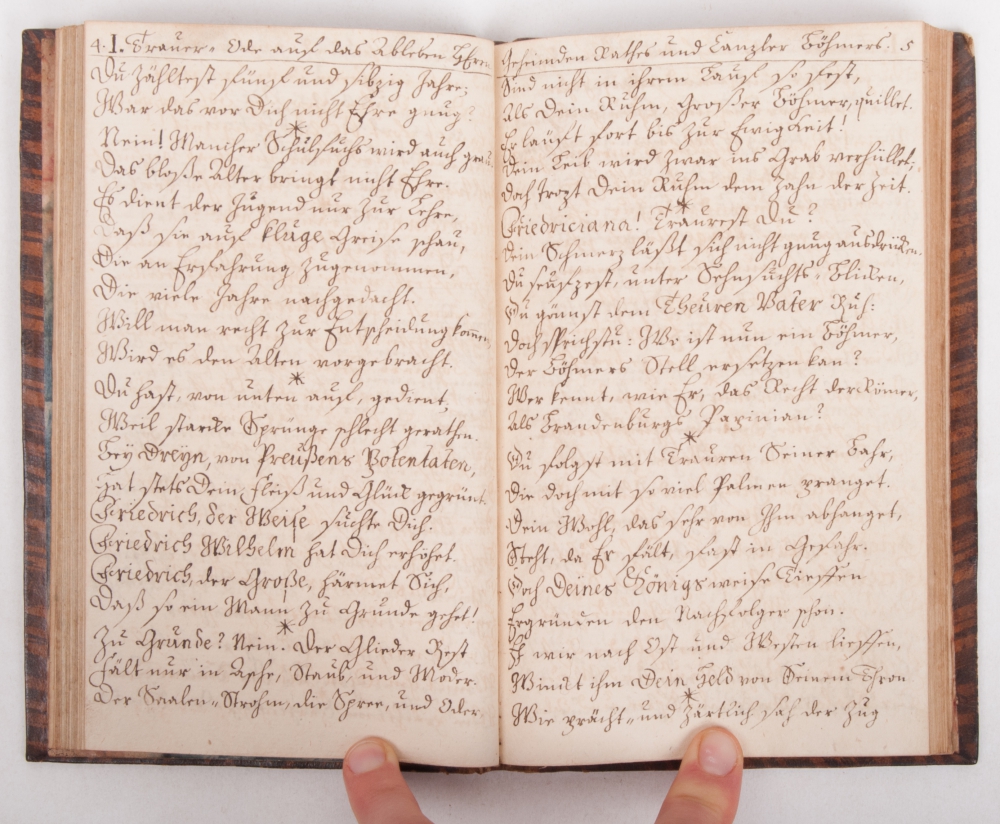 Sm. 8vo., leather, gilt-stamped spine, marbled endpapers, ex-libris (Bibliotheca Seckendorfiana), title with vignette, 48 hand-numbered pages followed by Fünf Neue Gedichte in manuscript by Dr. Johann Ernst Philippi. [Halle, 1749] on 39 hand-numbered pages; furthermore ca. 40 blank pp.