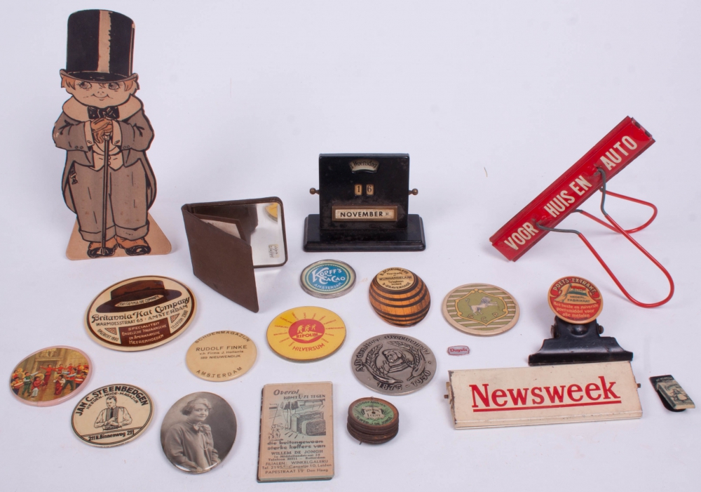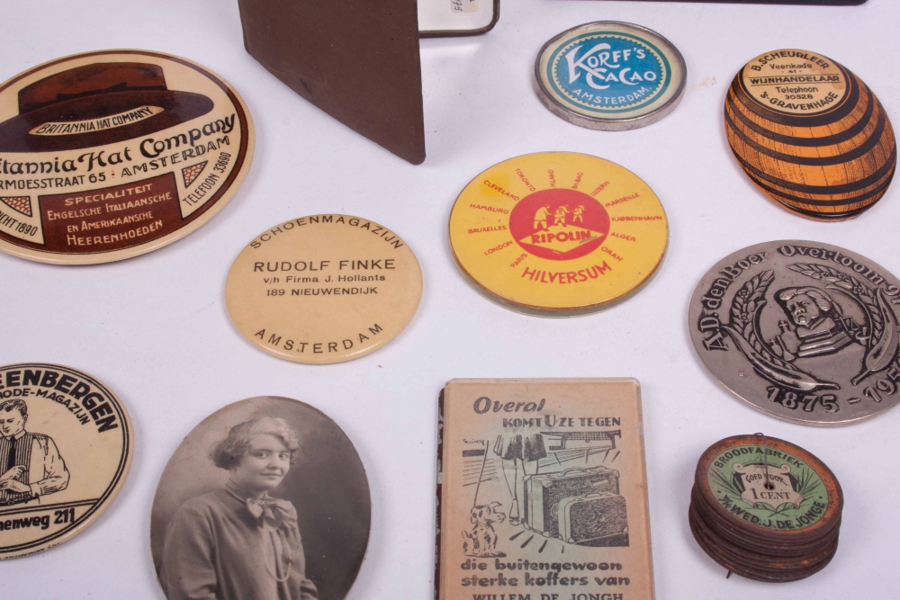 Lot of 12 promotional mirrors etc. issued by Jan C. Steenbergen, Heeren mode magazijn, Binnenweg 211, Britannia Hat Company, Warmoesstraat 65, Amsterdam - and 10 others, most '20s-'30s - and 8 various promotional objects, most '30s.