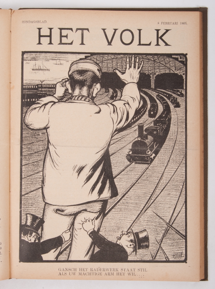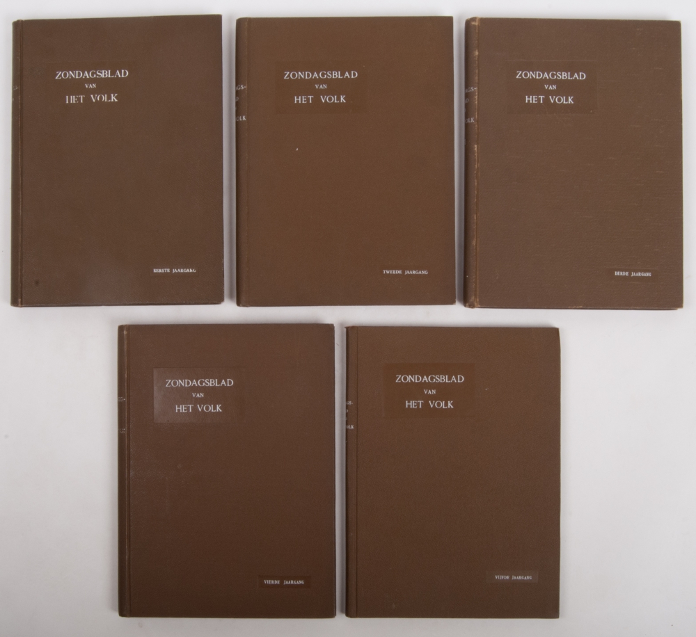 6 July 1902 to 30 December 1906. 1st to 5th year of this socialist Sunday magazine in 5 brown cloth bindings. Eds. Pieter Jelles Troelstra and P.L. Tak, frontpage illustrations Albert Hahn.