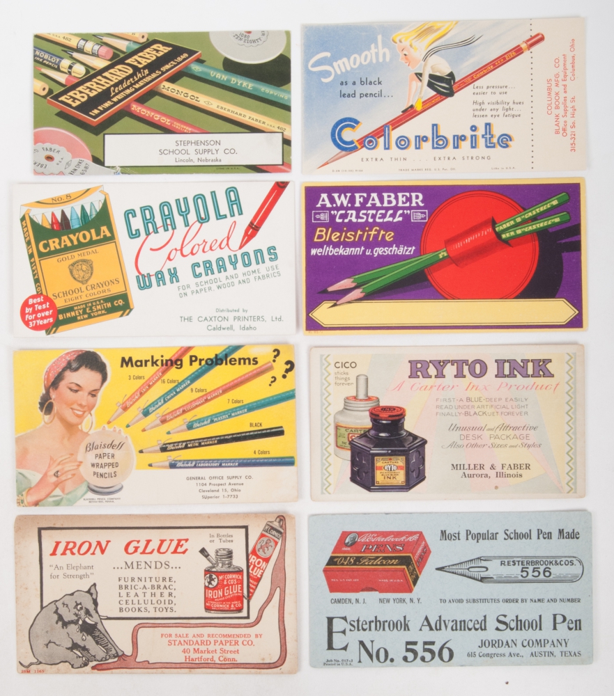 Lot with 100 blotting papers relating to pencils, pens and other office supplies. Mostly American and French. Ca. 1920-1960.