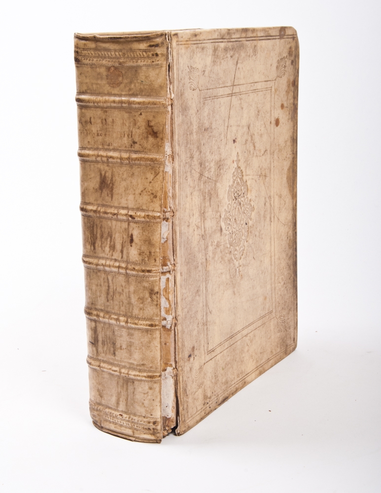 Blind-tooled parchment binding; spine loose for the larger part, 1 engr. has almost come loose, portrait and table sl. torn. Several auction results on inside front cover.