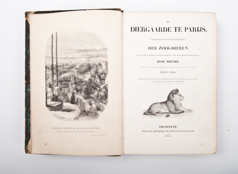 Beschrijving en levenswijze der zoogdieren - Boitard en J. Janin, Amsterdam, Elix Drukkers en Uitgevers, 1845. (28) LXVI 472 p. 4to. 1 folding map of the park, 4 hand coloured engravings, 2 portr. (Buffon and Cuvier), 51 engravings and several ills. accompanying the text.