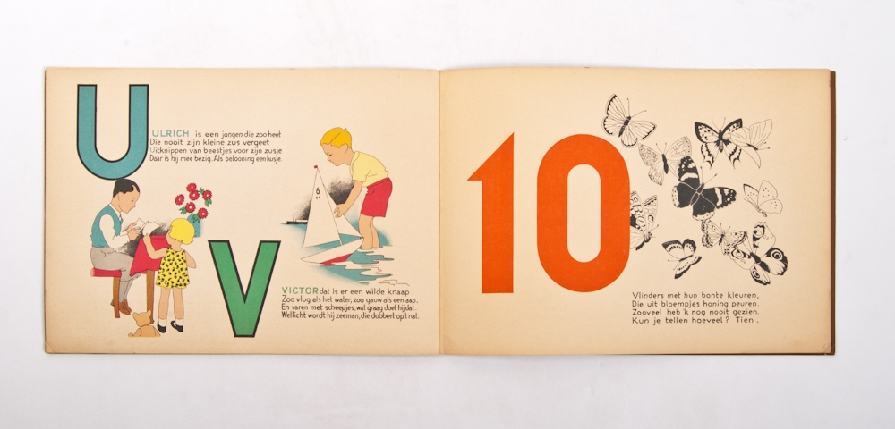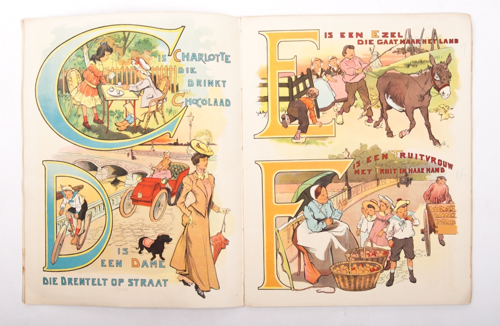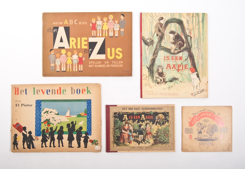 J. Vlieger, Amsterdam. Lith. gebr. Braakensiek, Amsterdam. Ca. 1900. New binding with orig. front cover, interior in good condition. + Van Arie tot Zus. Spellen en Tellen met rijmpjes en prentjes. Jan Wijga, Luii & Co, Amsterdam, 1933. + 3 others.