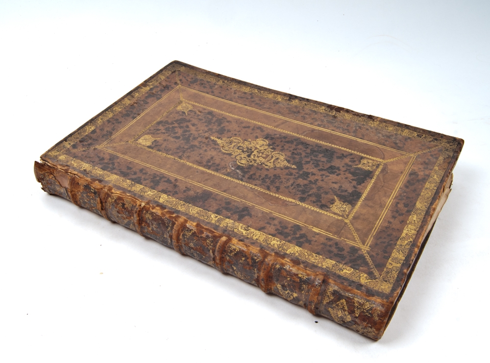 en de Nederlanden gepleegd in den Jaare MDCCXX. (Amst.), 1720, (2),25,(1),52,31,(1),8,10 text p., 75 engr. (double/folded) plates/maps, lavishly gilt contemporary leather binding, folio.
