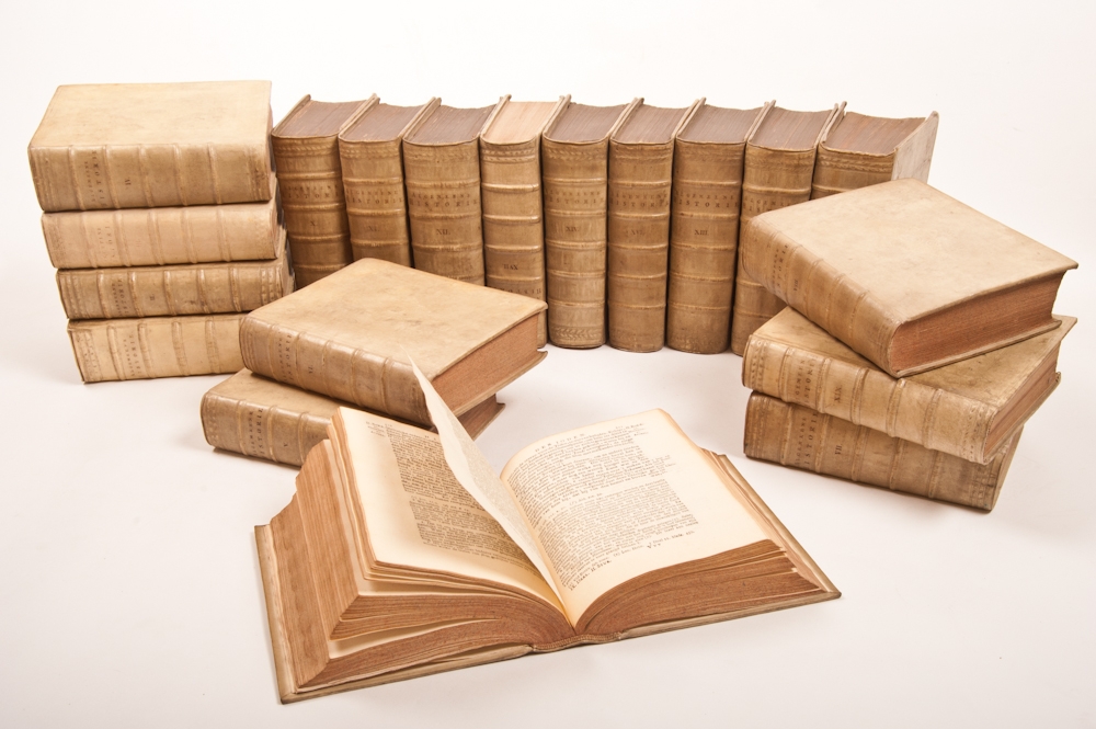Small 4to., unif. bound blind-tooled parchment bindings and number on spine, ex-libris on endpaper with countless maps, prints and tables. Lacks several maps and multiple portraits, otherwise an exceptionally fine series.