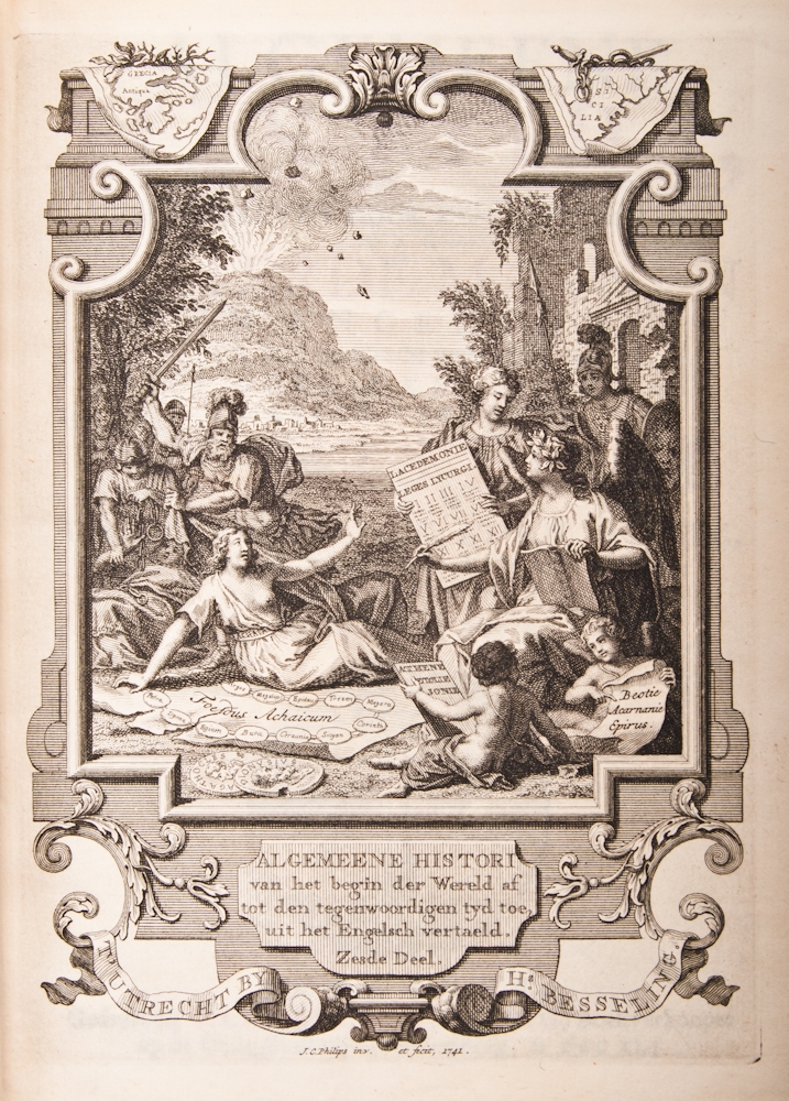 -Getrokken uit oorsprongkelijke schrijveren en opgehelderd met Landkaerten, Printverbeeldingen, Tijdrekenkundige en andere Tafelen ... Uit het Engelsch vertaeld ... door Kornelis Westerbaen W.Z. t'Utrecht bij Hermanus Besseling en Johannes Besseling (vanaf XIII), 1736-1752 in XVIII vols. and register section XIX.