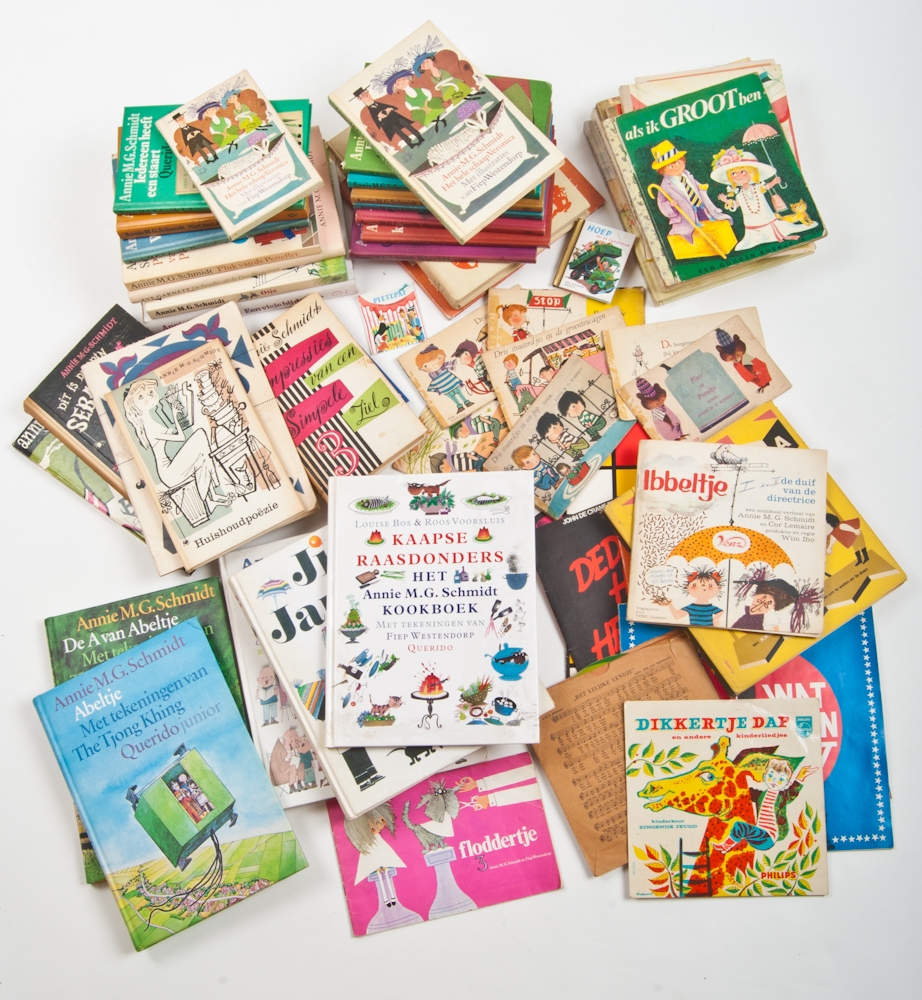 Op visite met de reus. Amsterdam, Querido junior, 1979. With pictures by Wim Bijmoer and 9 others from the series. + Jip en Janneke, Arbeiderspers, 1976. + 45 other books and commercial editions by Schmidt, primarily illustrated by Fiep Westendorp.