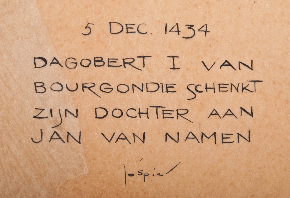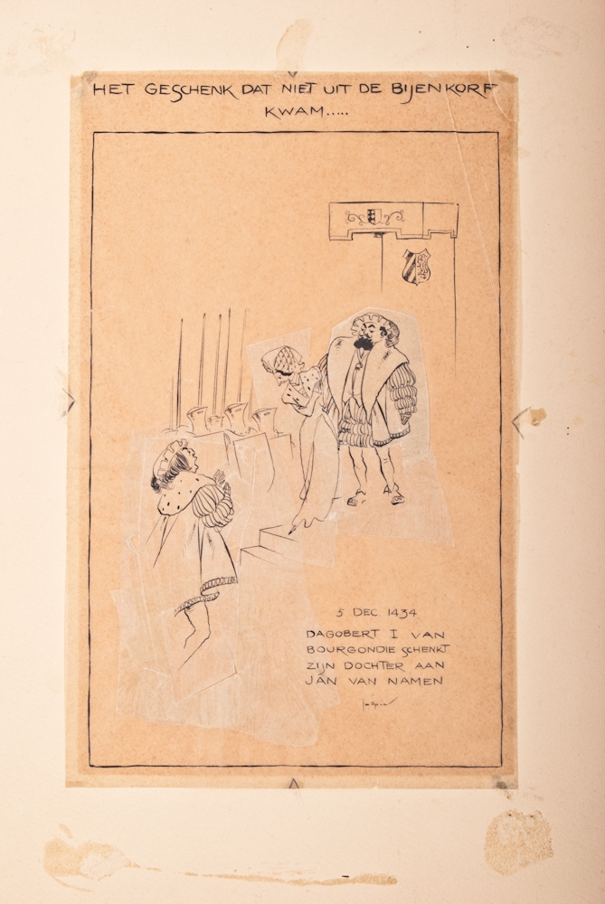 (1934?) Het geschenk dat niet uit de Bijenkorf kwam...... 5 Dec. 1434 Dagobert I of Burgundy offers his daughter to Jan van Namen. We do not know if the drawing was published. Indian ink on rice paper. 27 x 17 cm.