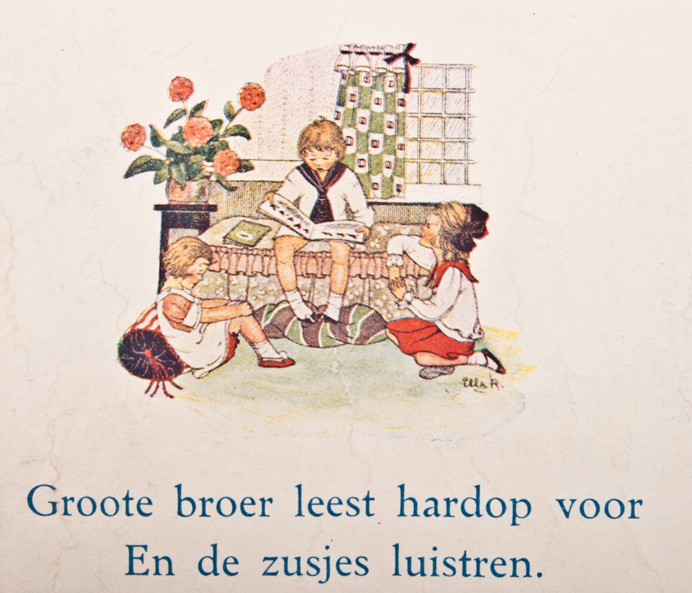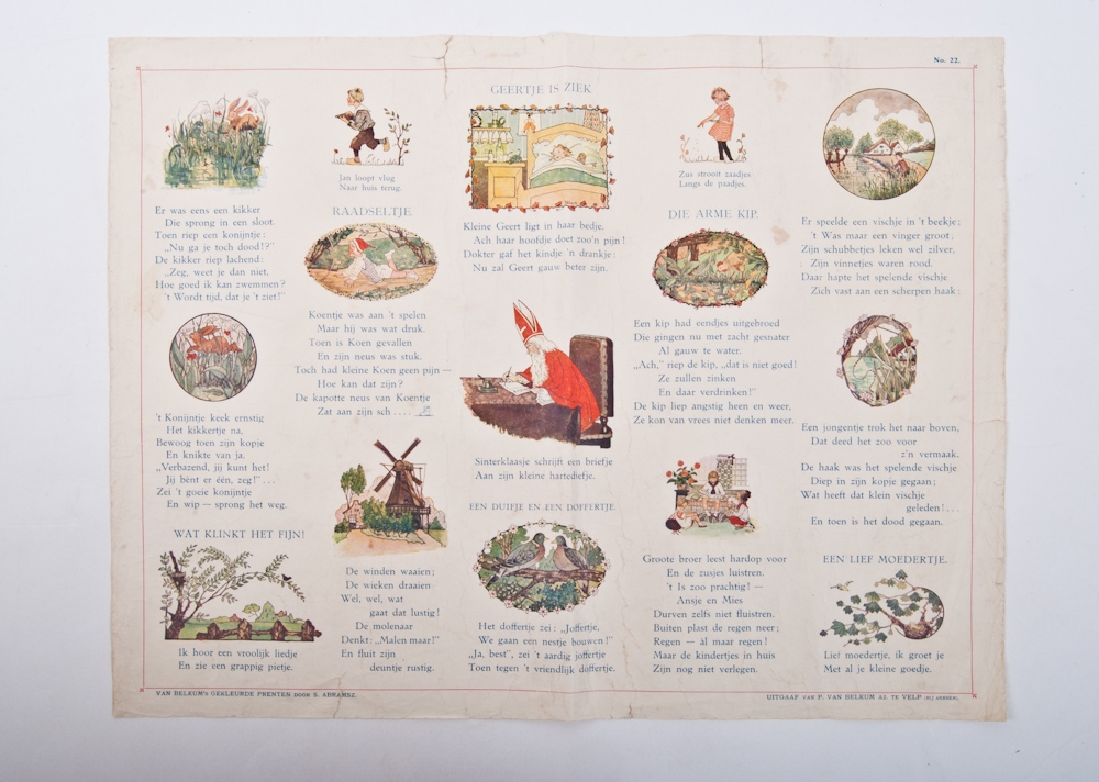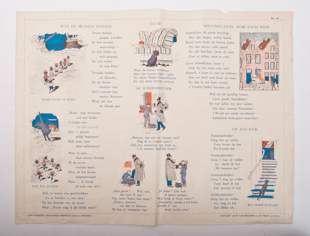Van Belkum's gekleurde Prenten by S. Abramsz. Uitgaaf van P. van Belkum Az. te Velp, ca. 1935. Nr. 22. and nr. 24. Print 22 contains 15 pictures with songs or texts, among which Sinterklaas. Print 24 contains 5 stories, including "Sinterklaasje, kom toch hier" and "De schoenpoetser". 37 x 48 cm.