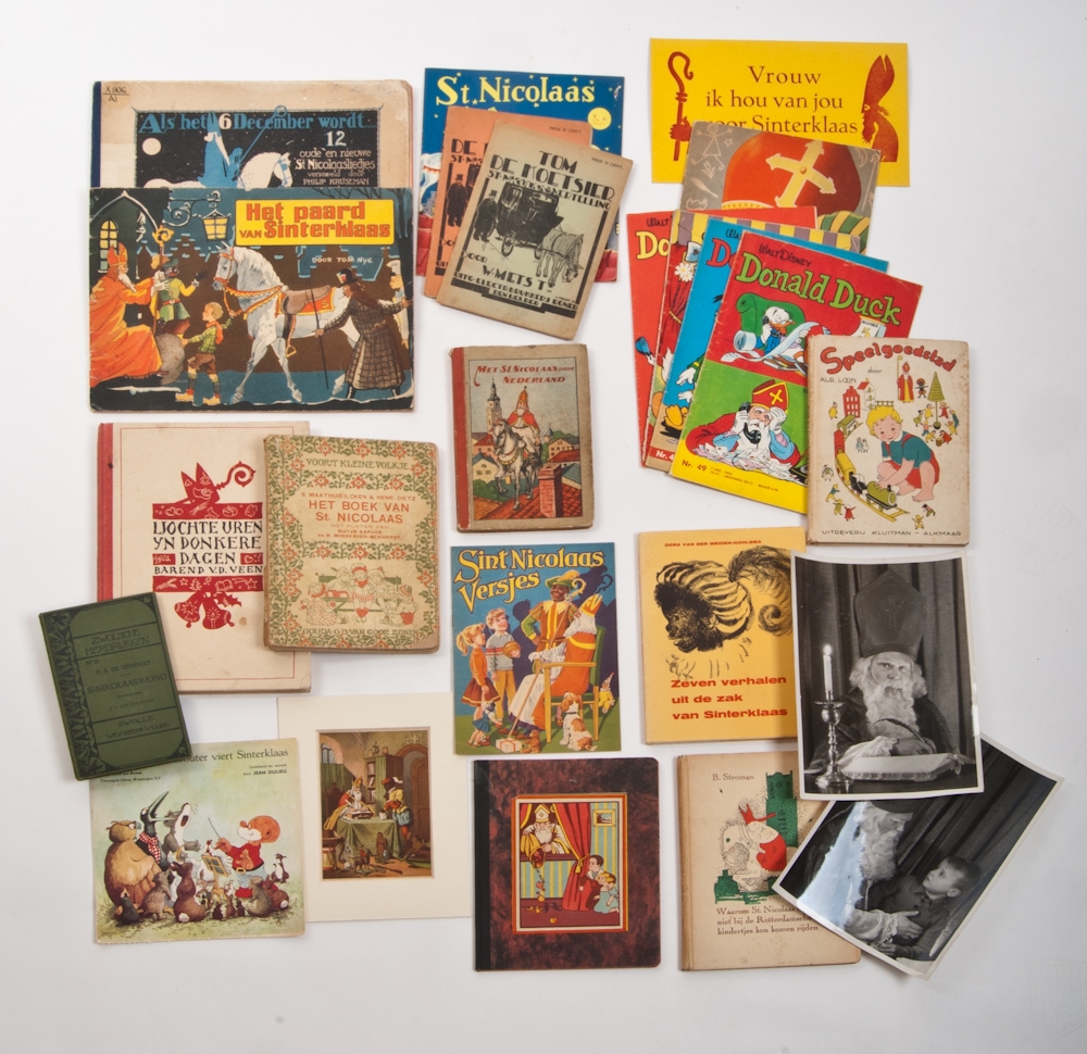 Aardige vertellingen voor onze jeugd. By H.C.J. with coloured plates, publ. Hecozet, Amsterdam. 60 p. + St-Nikolaasavond, P.A. de Génestet, Zwolsche Herdrukken nr. 21. Publ. J.H. van den Bosch, Zwolle, W.E.J. Tjeenk Willink, ca. 1900. 116 p. + Waarom St. Nicolaas in 1944 niet bij de Rotterdamsche kindertjes kon komen rijden. B. Stroman, W.L. & J. Brusse N.V. Rotterdam, 1945. With ills. by Aad de Haas. Geb. 48 p. - and 21 other editions/photographs Sinterklaas prints.
