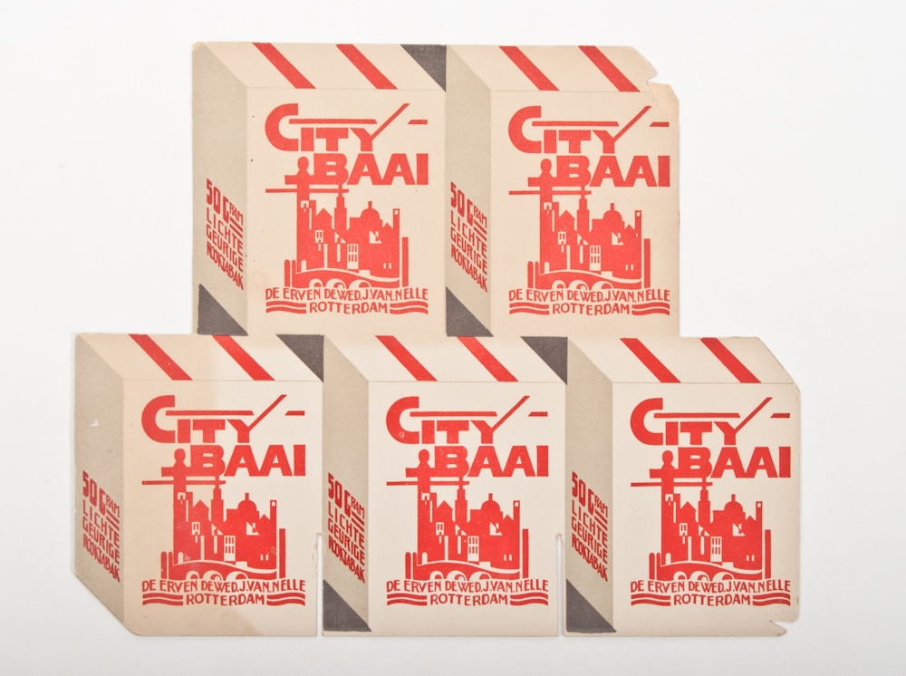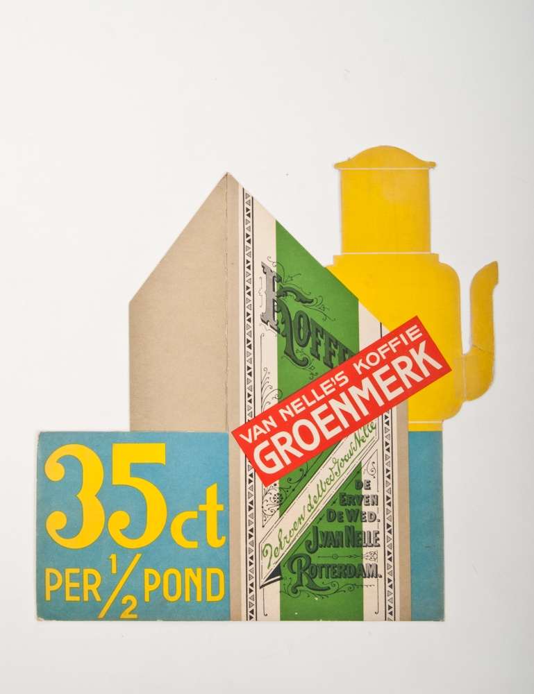Pyramid shaped display with the text "Rol zelf uw sigaret van van Nelle's Lichte Shaftabak. Ca. 1930. 39 x 31 cm + Van nelle's Koffie Groenmerk. 35 ct per 1/2 pond. Ca. 1925. 37 x 32 cm. + 1 other + advertisement (cardboard "steeds dezelfde geurige kwaliteit. Vraagt van Nelle's Theebuiltjes" - and 2 packagings. All from the 1920s-1930s.