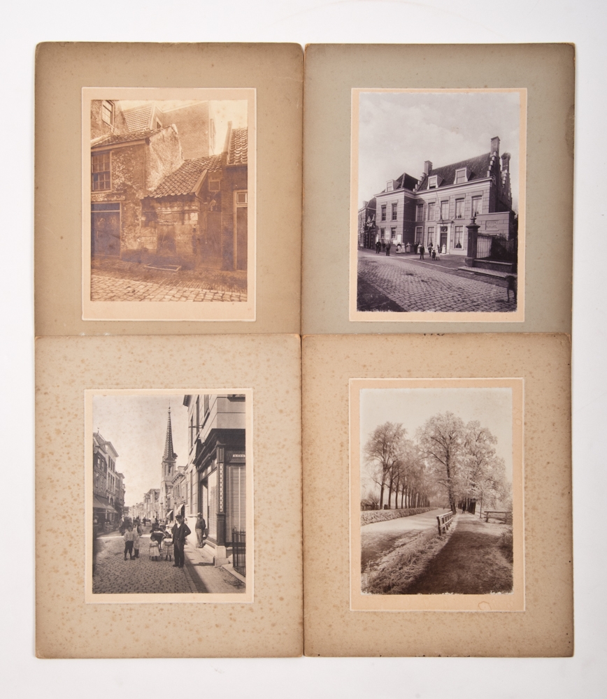 Photographer W. Pelgrom, Gorinchem Ca. 1890. 19 photographs on cardboard, large size, varying between 17 x 12 cm and 23,5 x 29,5 cm. With subjects such as the restoration of the Bridge at Arkelpoort, several shopping streets, houses etc. All in good condition.