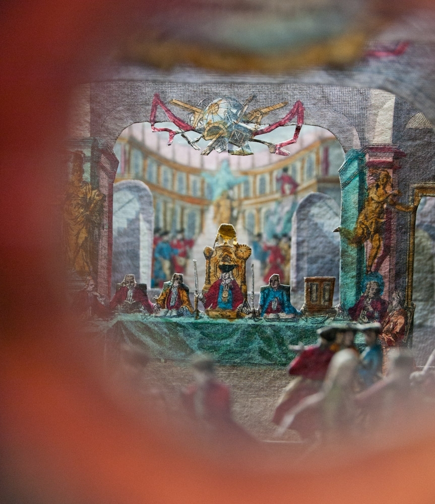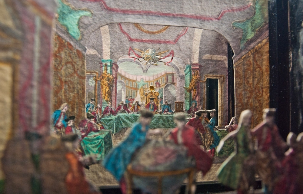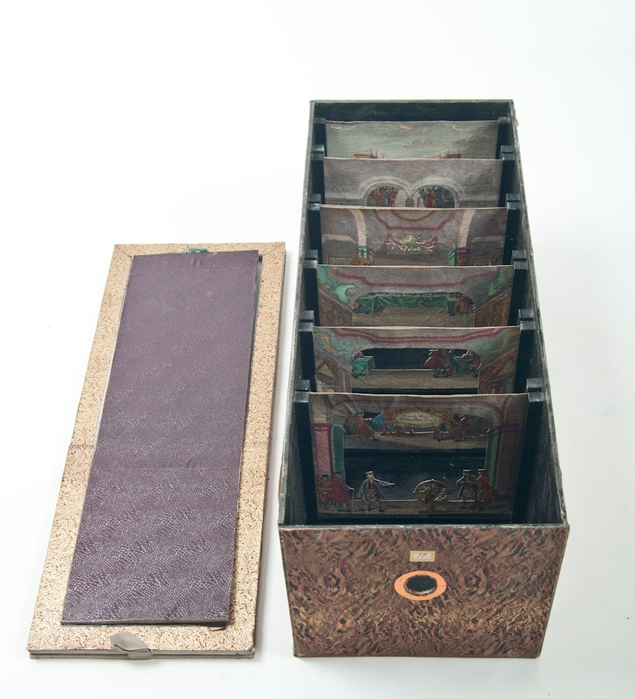 France-Maçons Freimaurer Loge. Ca. 1780, with 6 plates 16 x 21 cm. All original, in later show-box, 60x19x22 cm., covered in 19th century wallpaper. Different scenes in the lodge in layers, i.a. a globe. Charming item.