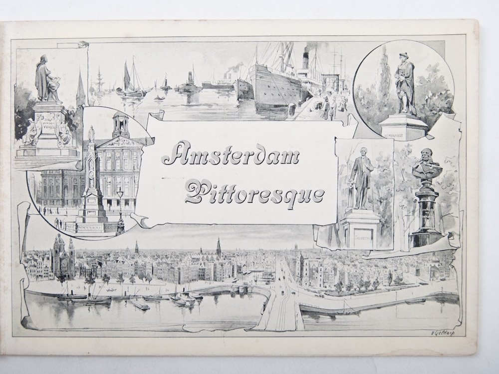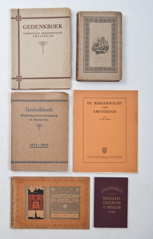 Compiled by Mr. J. van Lennep, Amsterdam, P. Meijer Warnars, 1832 xvi, 251,(3) p. With engr. frontispice and a double-p. + Amsterdam in Beeld, aangeboden door Hotel de l'Europe te Amsterdam, ca. 1890. + Gedenkboek Vrijwillige Burgerwacht Amsterdam. 1928. Sewed, 144 p. - and 3 others.