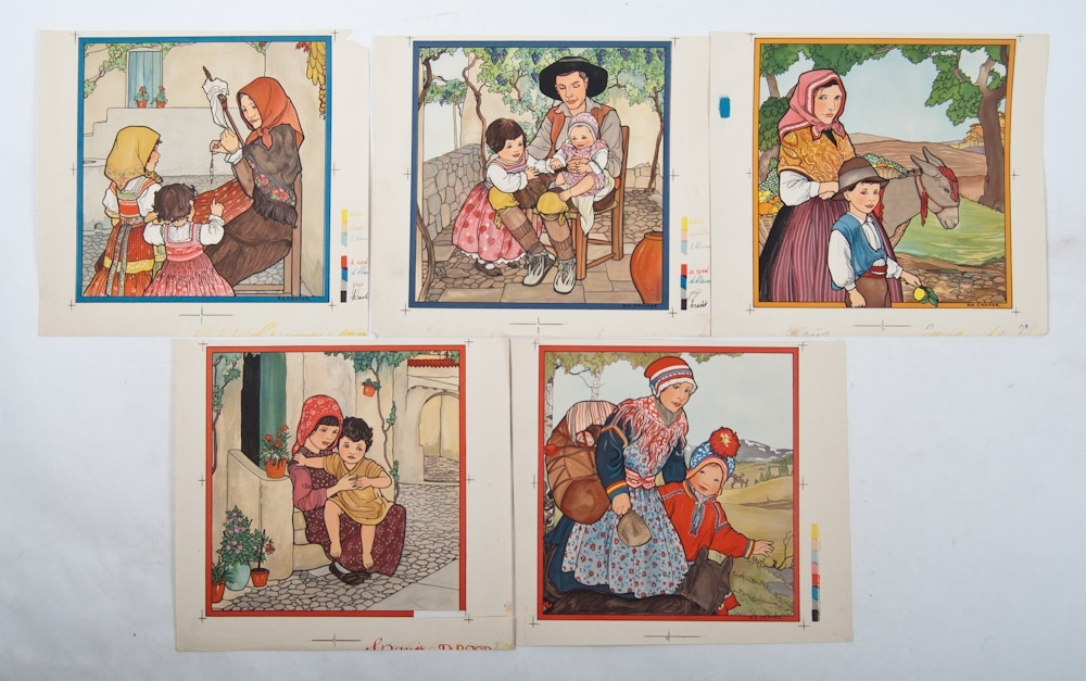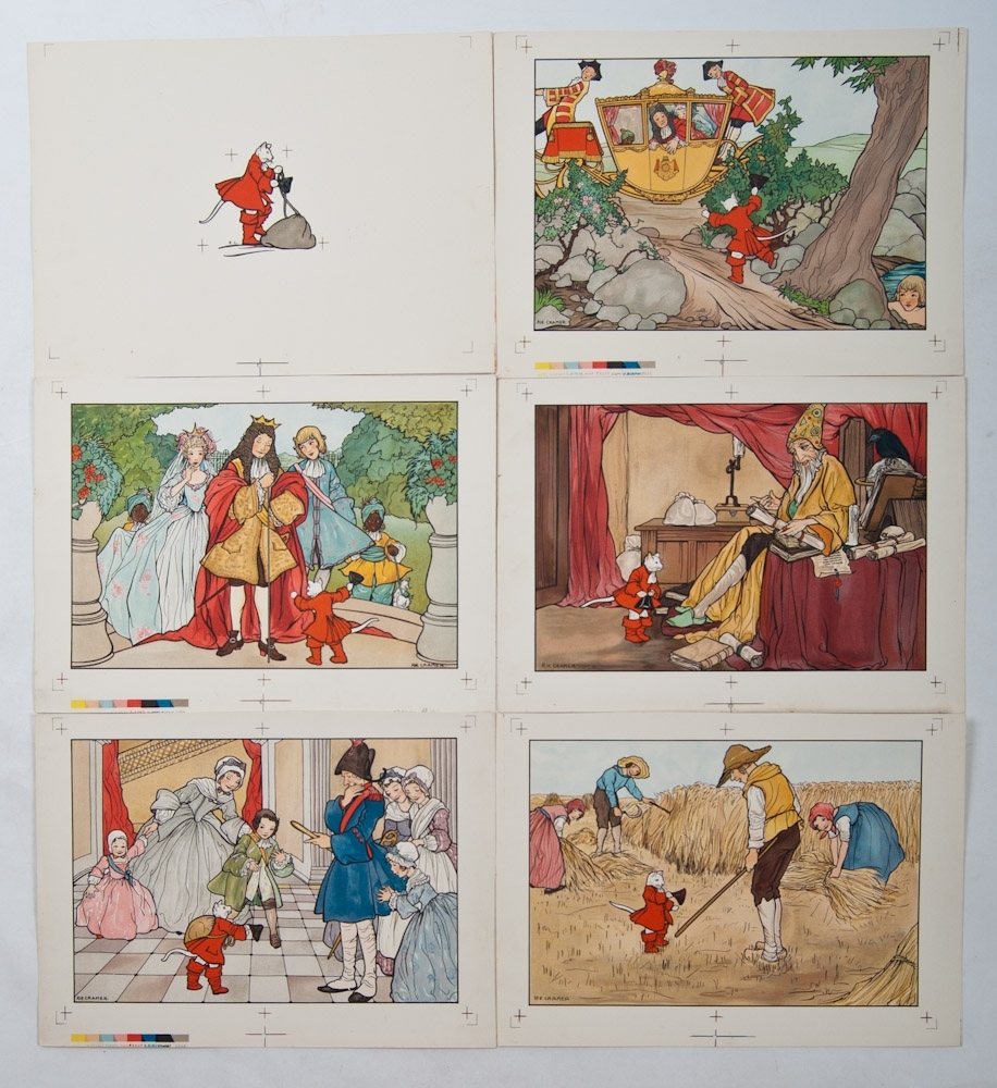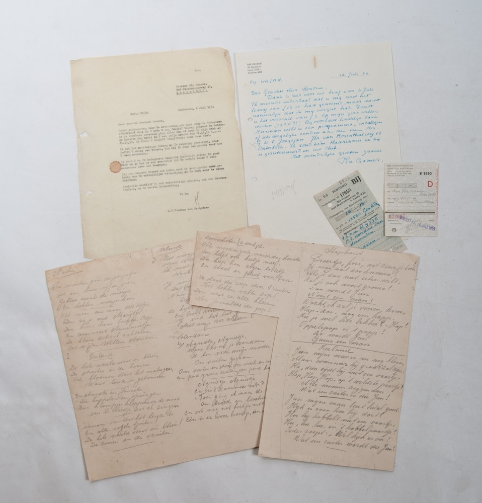 6 proofs of De Gelaarsde Kat + 5 other proofs + accompanying text in rhyme in handwriting - and a handwritten letter about a payment with the receipts.