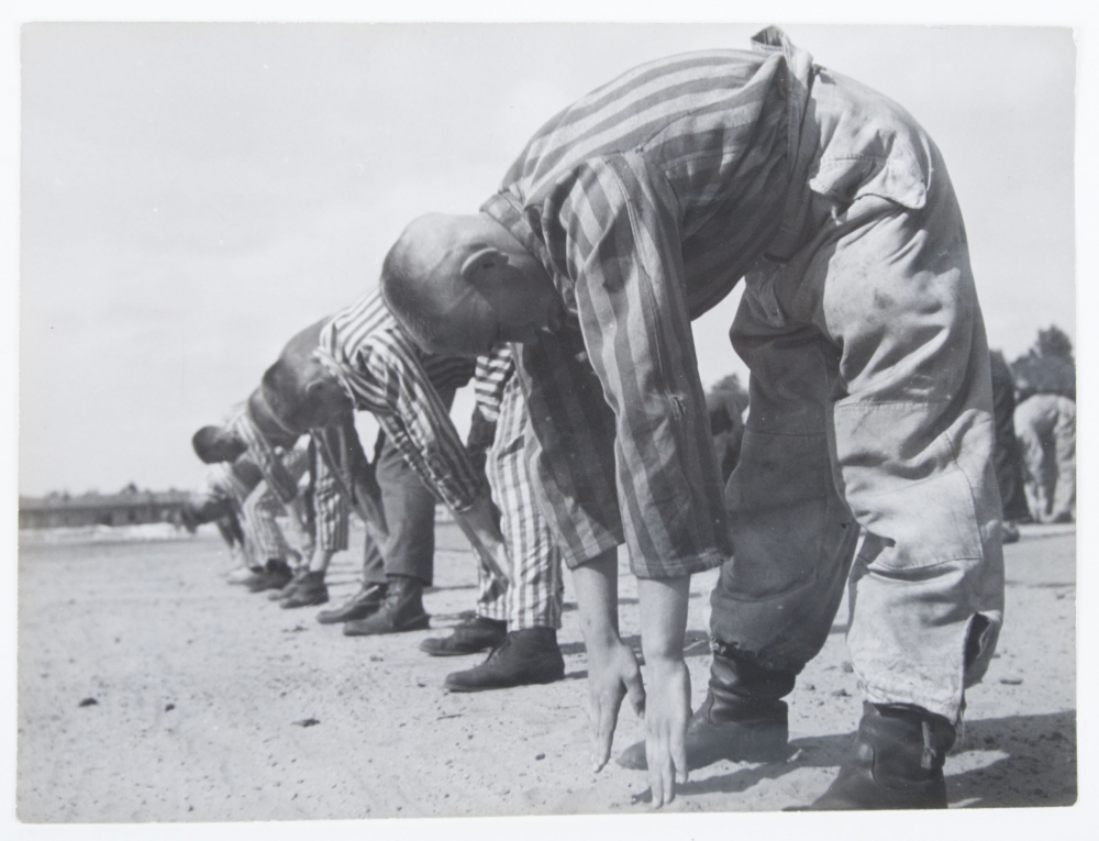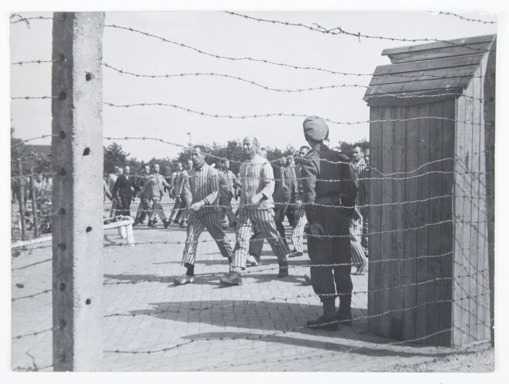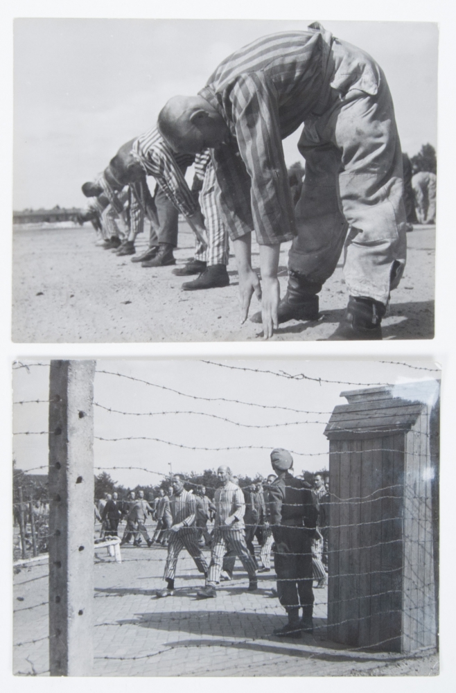"Strafgymnastiek op de binnenplaats." "Achter de secure prikkeldraadomheining, vindt het strafexerceeren plaats." Two photos, both ca. 18.5 x 24 cm. and on reverse with copright stamp "Anefo" (Algemeen Nederlandsch Fotobureau) and numbered "HL 4270"/"HL 4263" and typoscript strip with extensive clarification on reverse.