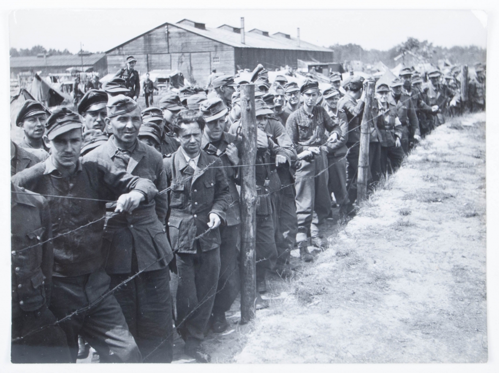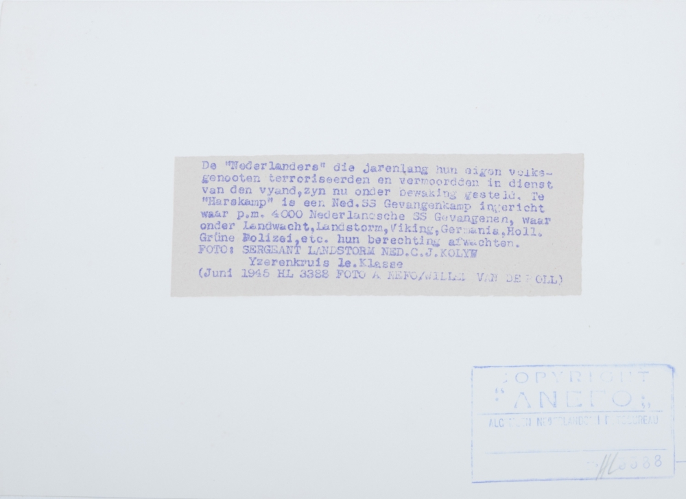 Iconic photo from a series taken at the Dutch SS prison camp at "Harskamp": "De "Nederlanders" die jarenlang hun eigen volksgenooten terroriseerden en vermoordden in dienst van den vyand, zyn nu onder bewaking gesteld. Te "Harskamp" is een Ned. SS gevangenkamp ingericht waar p.m. 4000 Nederlandsche SS Gevangenen, waar onder Landwacht, Landstorm, Viking, Germania, Holl. Grüne Polizei", etc. hun berechting afwachten".