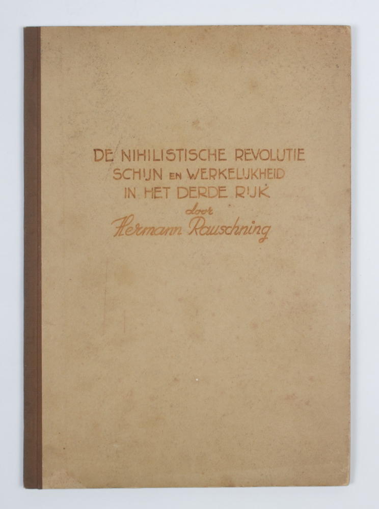 With 1 other typoscript: De Nihilistische revolutie, schijn en werkelijkheid in het Derde Rijk. By Herman Rauschning. N.pl. or date, 19 p., contemporary half cloth with title on front cover. Part or summary of the translation of the much more extensive work with the same title by Menno ter Braak (1939).