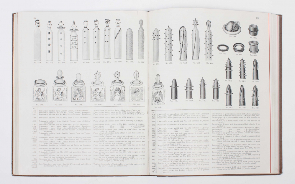 Noteworthy is the sale of a large variety of condoms: "Präservativs "Lustige Witwe" Das beste Präservativ der Gegenwart". With a happy scene of a row of condoms with tips with the heads of "Jockey, Automobisten, Student, Clown, Richter, Professor en Soldaten".