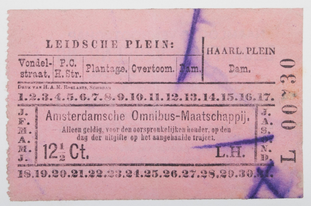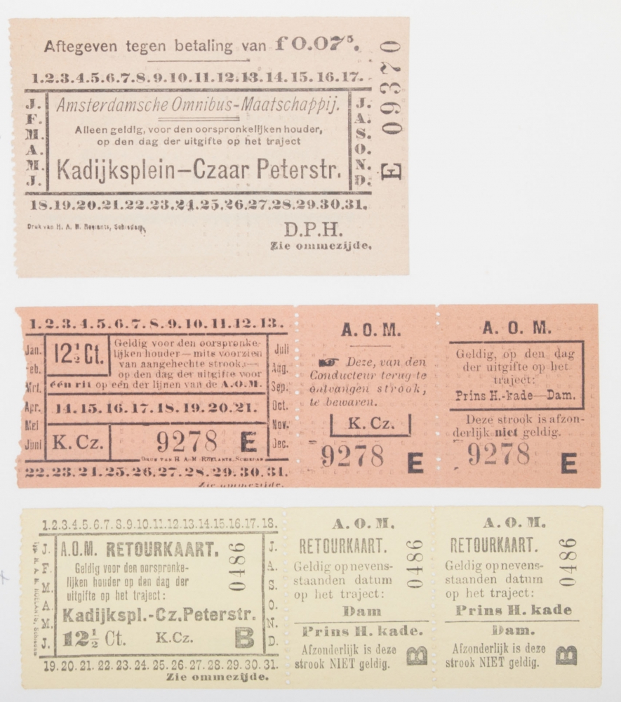 Gemeentetram Amsterdam. Tram tickets 1-7-1913 to 31-1-1949. All kinds of tickets (ca. 125) and divergent such as a military model and proof of free admission for a guide for the blind. Pasted in ring binder + Amsterdamsche Omnibus Maatschappij. Vervoerbiljetten 1872-1900. Album with 80 pasted tickets. All original + Album Gemeentetram Amsterdam, tickets 1.1.1900 - 30.6.1913. Album with 125 pasted tickets.