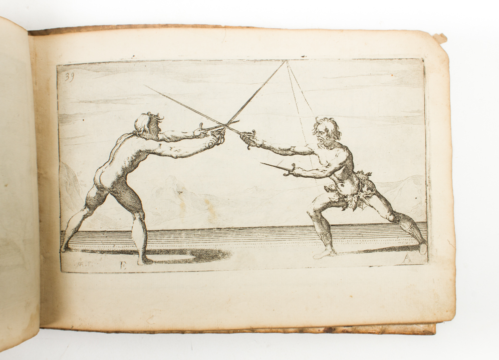 All early editions of this famous fencing book are (very) rare. The first edition of the book appeared in Siena, in 1610, with letterpress text. The second edition appeared in Bologna, 1652. Characteristic of this second edition was the fact that the title and the highly condensed text of the first edition were affixed in letterpress strips to the lower margin of the plates. Moreover, the plates for this second edition were heavily reworked and, remarkably, several plates had complicated scenes added behind the fencing figures, such as Adam and Eva in Paradise, Cain slaying Abel, Noah's Ark and the Tower of Babel.