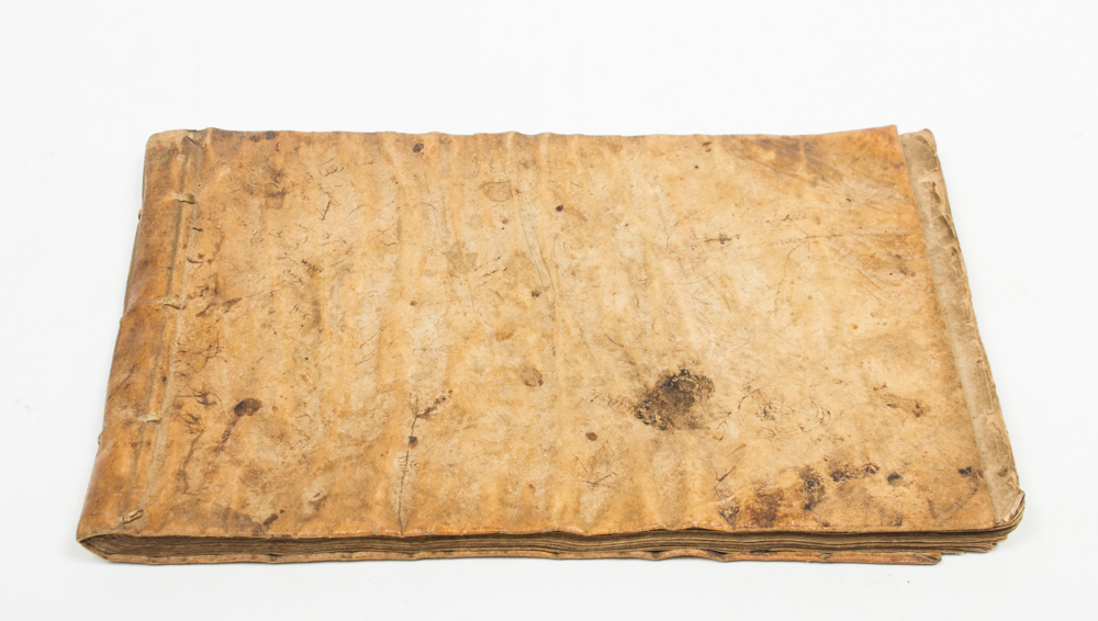Here and there waterstained, soiled and other small defects in margins (first and final leaves trifle frayed and tanned in outer margin). Several plates with old additions of letters or numbers in pen. Lacks free endpapers, endpapers on inside boards damaged; parchment soiled, wrinkled and with old pen scribbling and the back cover lacks a corner.