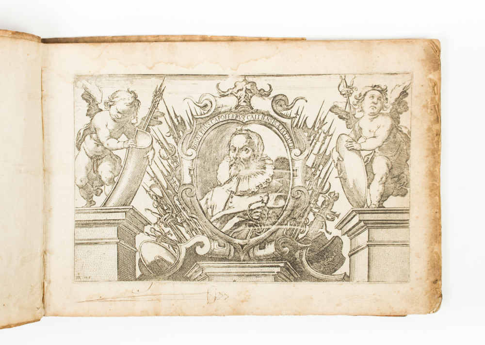 No place, publisher or year (after 1652), engraved portrait of the author, engraved coat of arms of Francesco Maria Feltrio della Roevere, duke of Urbino with the personifications of Justitia and Prudentia on both sides, followed by 43 numbered, engraved plates by R. Schiaminossi, bound in Italian limp parchment, oblong 4to.