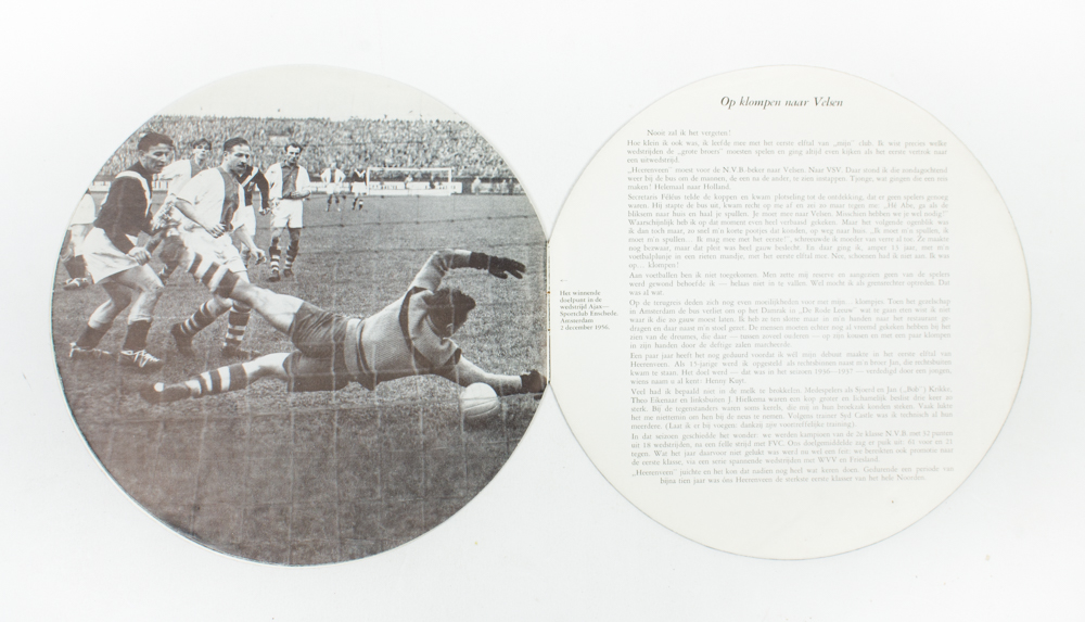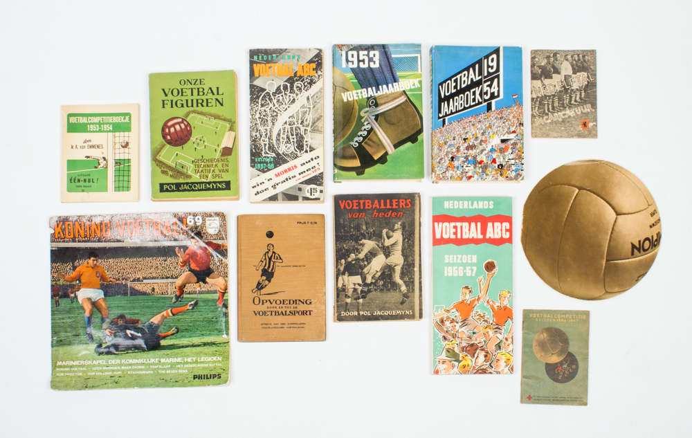 Voor North-State Rookers. Brown & Williamson Tobacco Corp., 1934. 32 pp. Stapled. Sev. pages with written results + Voetballers van heden. Pol Jacquemyns, Vlaamsche Sportuitgaven, Brussels, 2nd ed., 1944. 179 pp. Paperback + Voetbalcompetitie Seizoen 1946-1947. Uitg. ten bate van het Nederlandsche Roode Kruis. 32 pp. Results noted on middle page + Voetbalcompetitieboekje 1953-1954. A. van Emmens, uitg. één-nul!, The Hague. 92 pp. + Voetbal-Leven Abe Lenstra vertelt zijn voetbalcarrière. Eerste Nederlandsche Levensverzekering, ca. 1955. Die-cut in the shape of a football, 20 p., half photos, half text + Koning Voetbal! '69. Philips - and another 5 items: LP record with music by the Marinierskapel in gatefold.