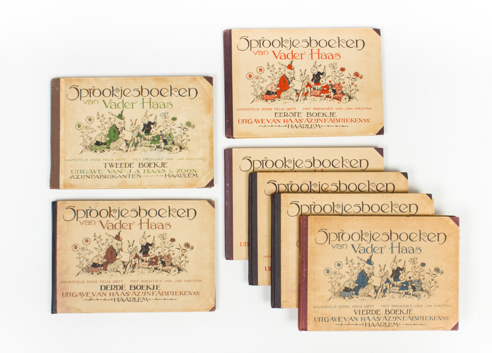 naverteld door E. Dopheide-Witte (Tante Lize), Illus. Jan Wiegman. Complete set of 7 half cloth books. With 5x 24 and 2x 21 pictures.