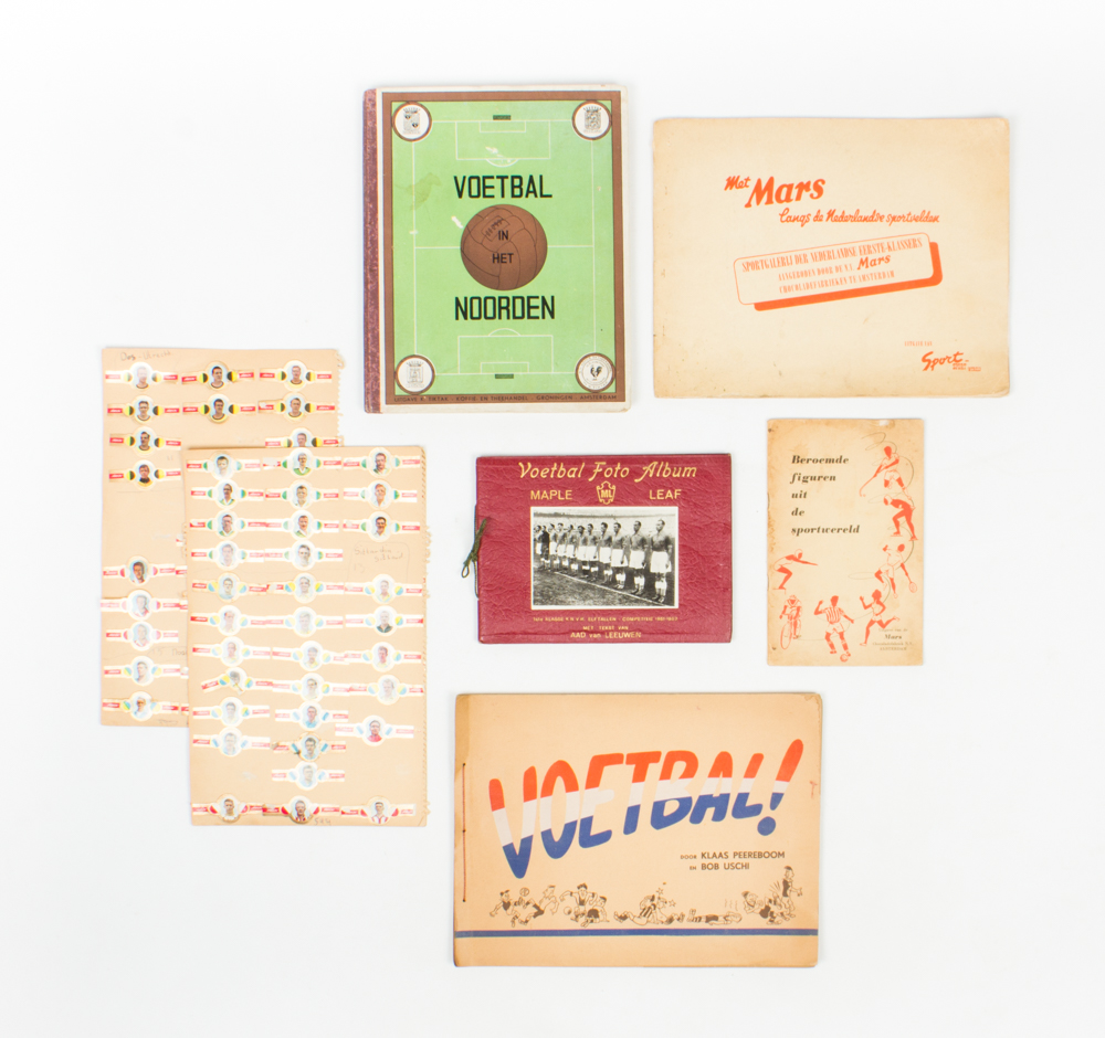 Maple Leaf Voetbal Foto-Album. 1e klasse K.N.V.B. elftallen-competitie 1951-'52. Met tekst van Aad van Leeuwen. Complete with 56 pictures and pasted front plate. Good copy + Picture album Tiktak Theehandel Groningen: Voetbal in het Noorden. 1939, 72 p. Complete with all 90 pictures and XV large plates + Mars Chocoladefabriek N.V. Amsterdam; Beroemde figuren uit de Sportwereld + Met Mars langs de Nederlandse sportvelden.