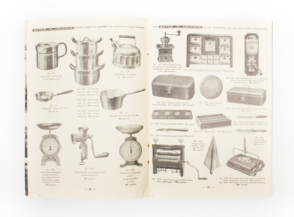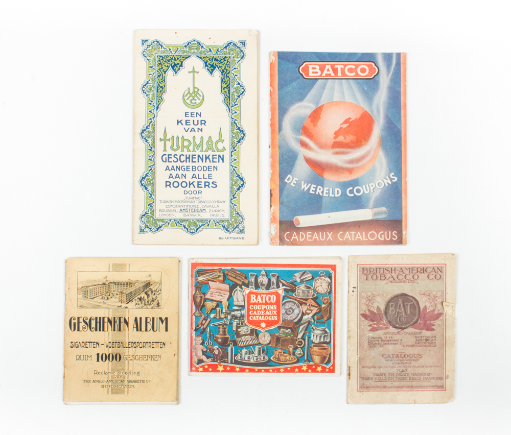 Lot with gift catalogues. Een keur van Turmac Geschenken aangeboden aan alle Rookers door Turmac, Amsterdam, 8th edition, ca. 1920. 92 pp. Stapled + BATCO (British-American Tobacco Co. Cadeaux catalogus. Ca. 1925. 98 pp. Stapled + another 2 Batco catalogues from the same period - and Geschenken album sigaretten-voetballersportretten, Reclame-afdeeling van The Anglo-American Cigarette Co, Eindhoven, ca. 1920. 96 pp. Stapled.