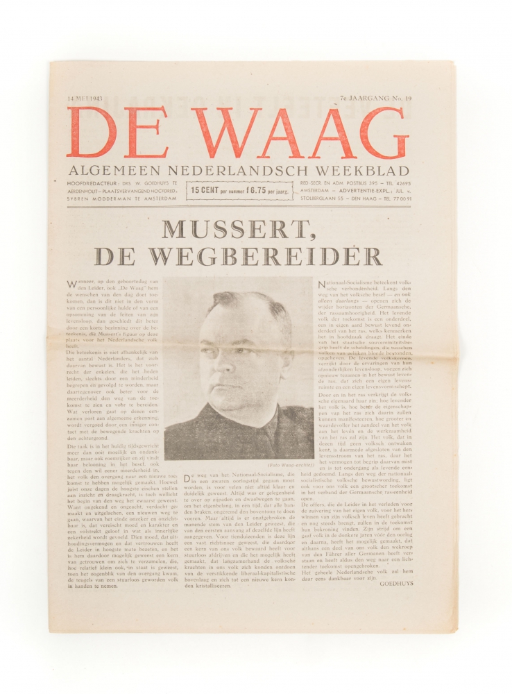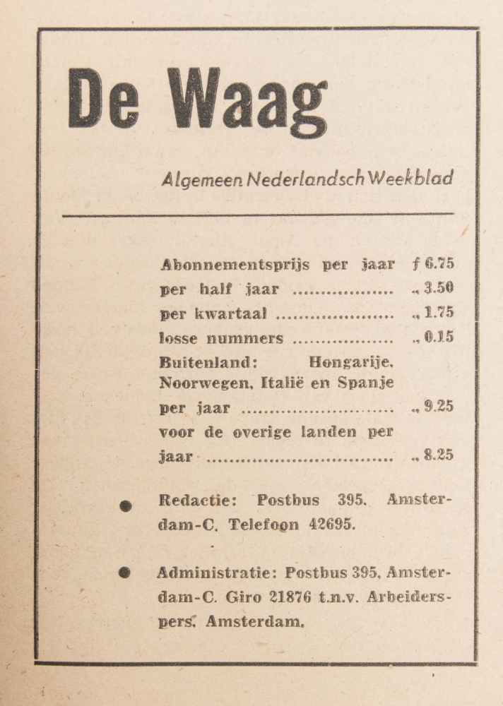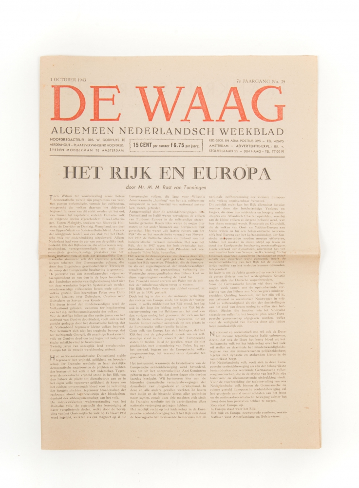 Algemeen Nederlands Weekblad. Lot with 39 issues of De Waag, 6 January 1939-1 October 1943, third to seventh volume, incomplete, 41.5 x 30 cm. Good condition, some foxing.