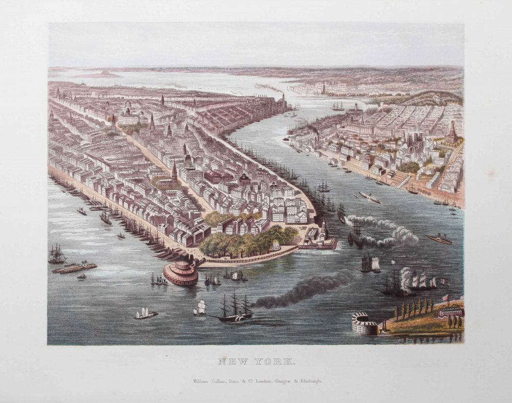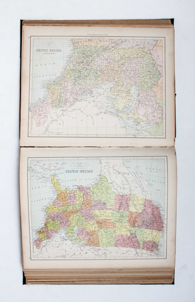of modern, historical, classical, and physical geography. London and Glasgow, W. Collins, Sons, & Company, 1878, (4),219[= 222] p., with 16 fine lithographed city views printed in colour and finished in hand-colouring, 124 chromolithographic maps (mostly full-page, and including 41a-41d) and 2 monochrome plates with sections of continents, text with many woodcut illustrations, later half cloth with parts of the original backstrip pasted, folio.