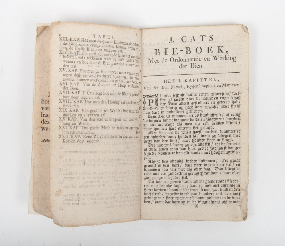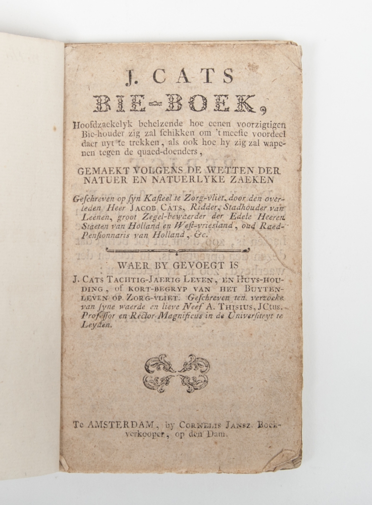 Hoofdzaekelyk behelzende hoe eenen voorzigtigen Bie-houder zig zal schikken om 't meeste voordeel daer uyt te trekken, als ook hoe hy zig zal wapenen tegen de quaed-doenders, gemaekt volgens de wetten der natuer en natuerlyke zaeken. Geschreven op syn Kasteel te Zorg-vliet, door den overleden Heer Jacob Cats (...). Waer by gevoegt is J. Cats Tachtig-Jaerig Leven, en Huys-houding, of kort-begryp van het Buyten-leven op Zorg-vliet. Amsterdam, Cornelis Jansz. Boekverkooper, op den Dam, n.d. (not before 1660), 2 parts in one volume (second part also with its own title page), 4,40; 44 p., later endpapers and cover, small 8vo.