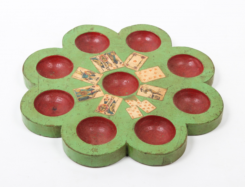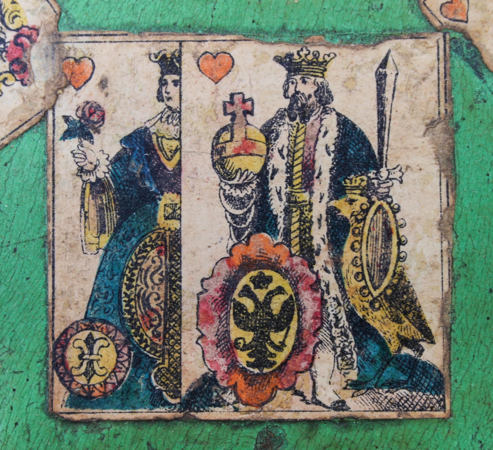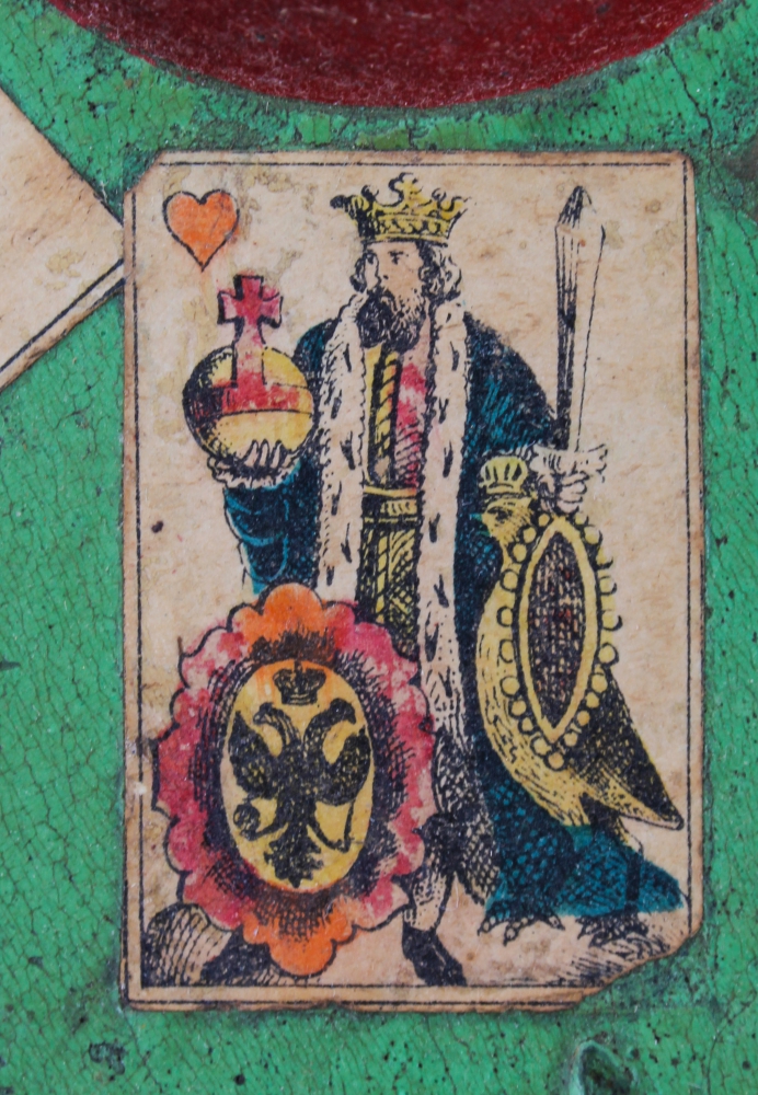 Poch board. Painted wooden board, ca. 1840, with pasted playing cards - and German cardboard Poch board (light damage to edge). Made for the Dutch market, with Dutch game rules, ca. 1900.