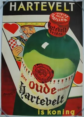 This item contains no English description. See the Dutch description: Hartevelt zeer oude genever. Frans Mettes. Uitgever Reclamebureau Talsma. Ca. 1953.