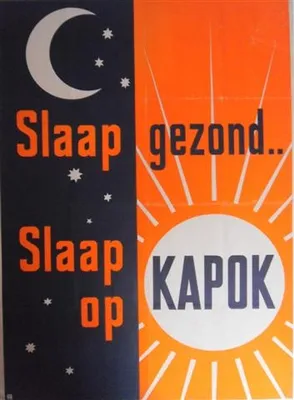 This item contains no English description. See the Dutch description: Slaap gezond, slaap op Kapok. Palm drukkerij. 114x82,5 cm.