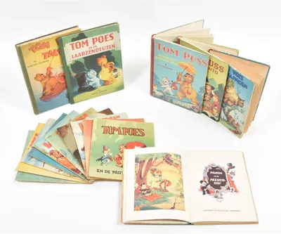 Incl. a.o.: (1) Tom Puss at the Panto. London, Birn Brothers, (1950). Hc in hcl. Former owner's entry upper flyleaf. (2) Tom Puss Tales. Ibid., idem, (1946). Hc in hcl. (3) Tom...
