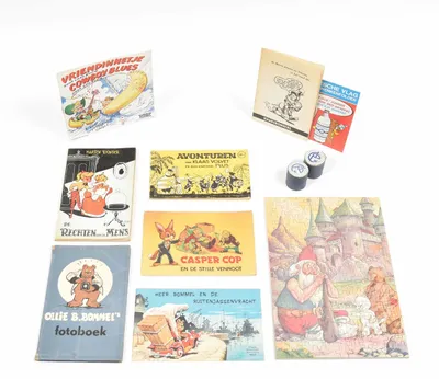 Two different sheets with poetry scraps. E. Olssen & Co, 1950. (2) Tom Poes en de Watergeest. De Bezige Bij, 1950. Cover minor dam., internally fine. (3) Two Ollie B. Bommel plaatjesalbums...