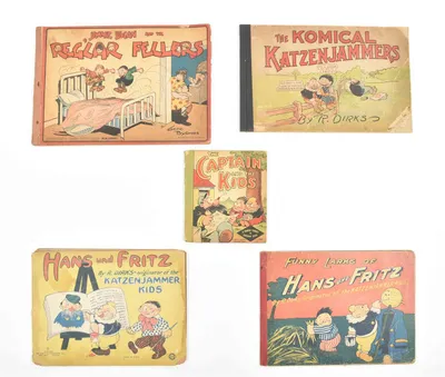(1) Hans und Fritz. Akron, Saalfield, 1917. Pictorial wr. Obl. folio. Ex libris inner front cover. (2) Funny Larks of Hans und Fritz. New York, Press Publishing, 1916. Pictorial...