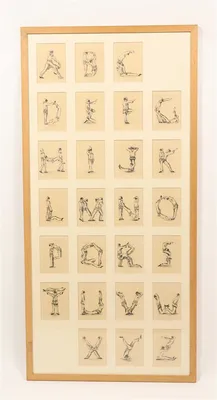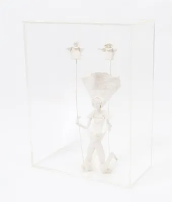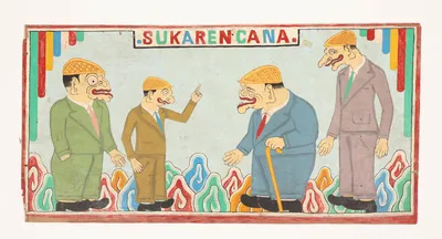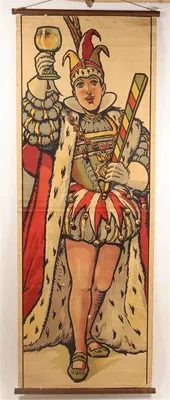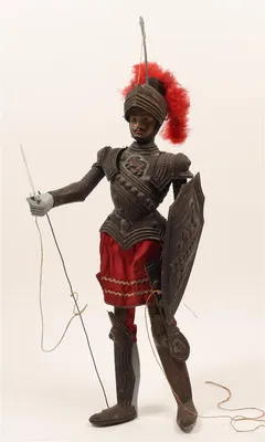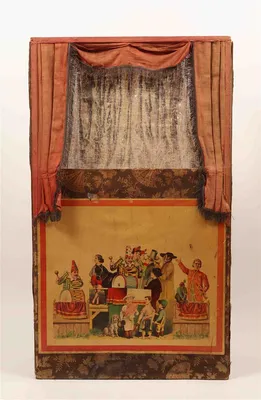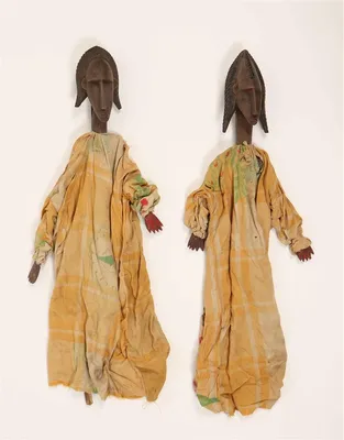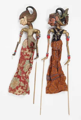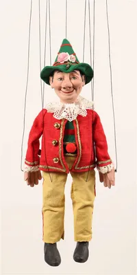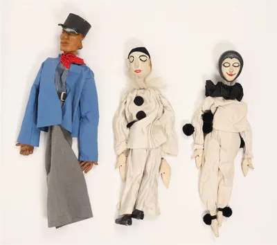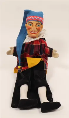 Hand puppet, height 53 cm, w. carved and painted wooden head, otherwise entirely of cloth. (2) Mr. Punch. Hand puppet, height 53 cm, carved and painted wooden head, hands and legs,...