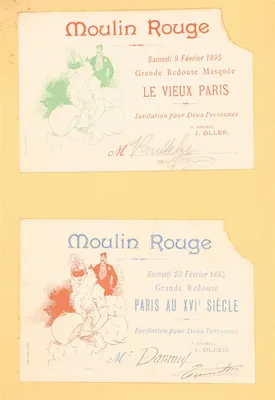Ten invitation cards 1890s, var. sizes. Most ill. by Roedel. Both used and unused. mounted in two albums. Together 18 additional ephemera, all French, ca. 1890s. Incl. invitation...