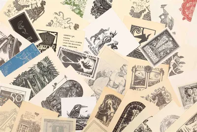 Var. (mainly Dutch) artists, techniques and sizes, incl. a few orig. designs and several ex libris present in multiple copies, kept in sm. board box. Ex collection Dick Dooijes...