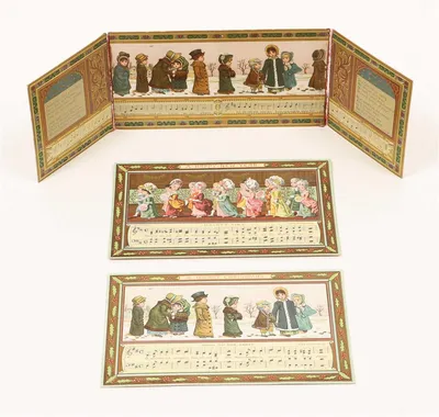 Chromolithographs. Incl. a.o. (1) Advertising cards samples, series of six, 5 x 9 cm. (2) Cut-out figure, h. 5 cm. (3) Christmas card w. song, foldable. (4) Six Christmas postcards.