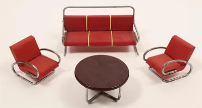 Czechoslovakia, ca. 1930. Tubular steel, wood, artificial leather, bakelite. Sofa: height 13 cm, length. 25 cm. Two armchairs: height 9 cm, width 9 cm. Table: height 8 cm, diameter 14.5 cm.