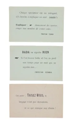 Collection of three leaflets, printed black on green and brown paper. Contains 'Dada ne signifie rien', 6.9 x 10.5 cm, 'Chaque spectateur', 6.9 x 10.7 cm, and 'Taisez-vous', 6.8...