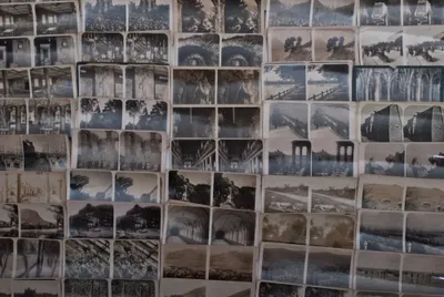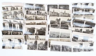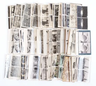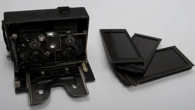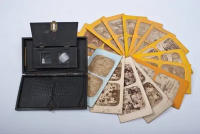 Folding model, 2 lenses, 15x18x11 cm. (when folded out), ca. 1900. with 15 albums of stereo photographs. The photographs are not glued onto paper paper but have been put in a...