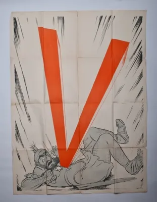 M.M., ca. 1928. Poster with anti-Semitic scene, in which a man wearing a Jewish badge in Roman costume and broken sword is being defeated by a giant letter V.