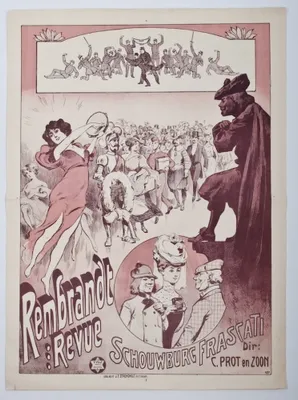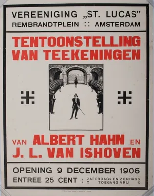 Exhibition of Teekeningen van Albert Hahn and J.L. van Ishoven. Opening 9 december 1906. Entrance fee 25 cent. N.V. Electrische Drukkerij "Vooruitgang", Amsterdam. 67x52,5 cm. On linen.